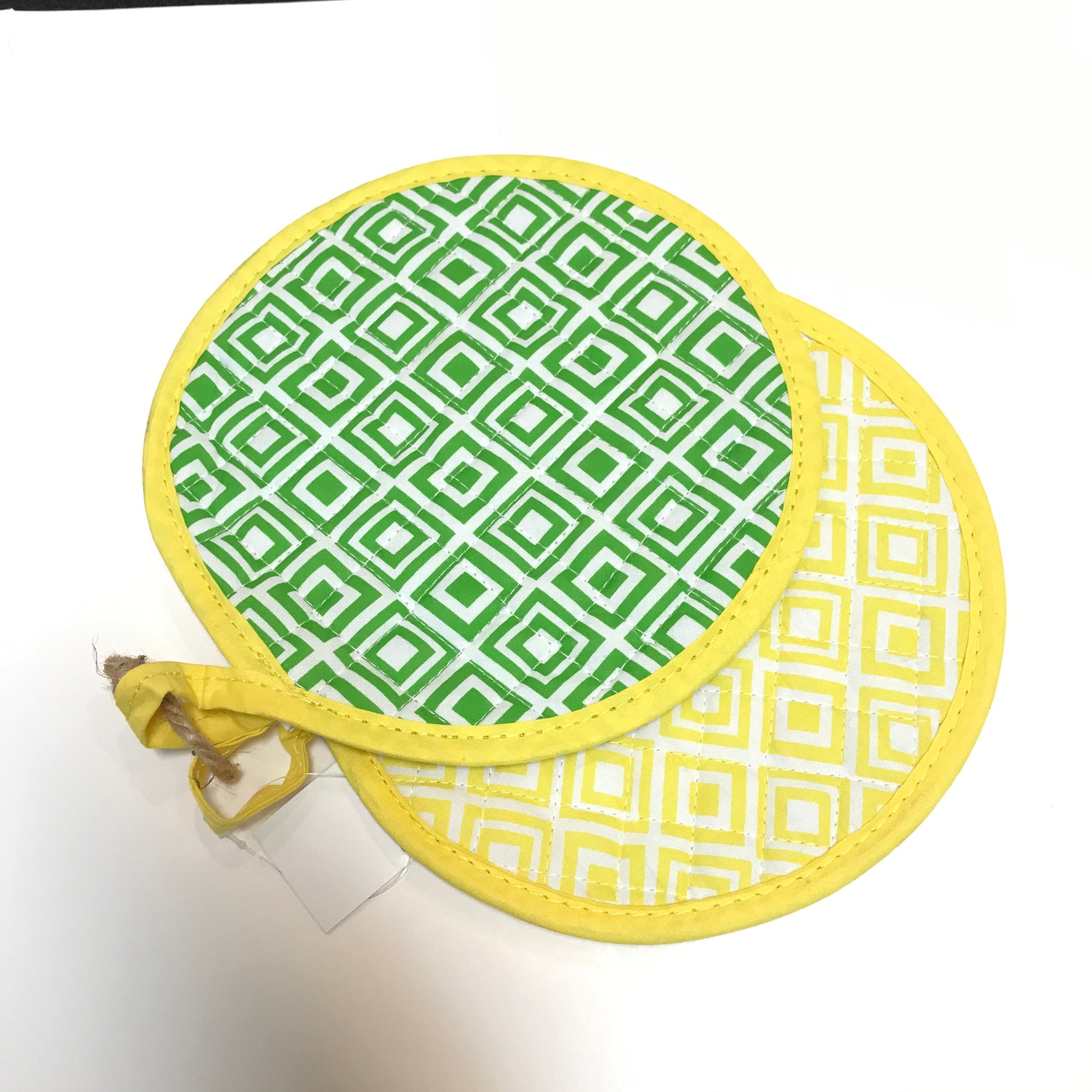Keep your hands safe and your kitchen stylish with this playful set of two quilted fabric pot holders. Each reversible 7.5" diameter pot holder offers double the fun and protection, making it easy to grab the right side for your mood or your kitchen decor. Perfect for handling hot pots, pans, and dishes, these pot holders combine practical heat resistance with a charming, cozy look. Whether you're baking, cooking, or serving, this set adds a splash of color and comfort to your culinary adventures.
